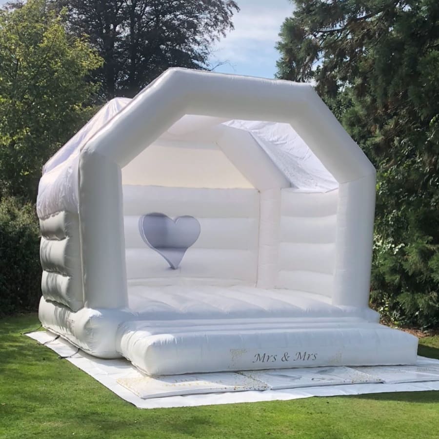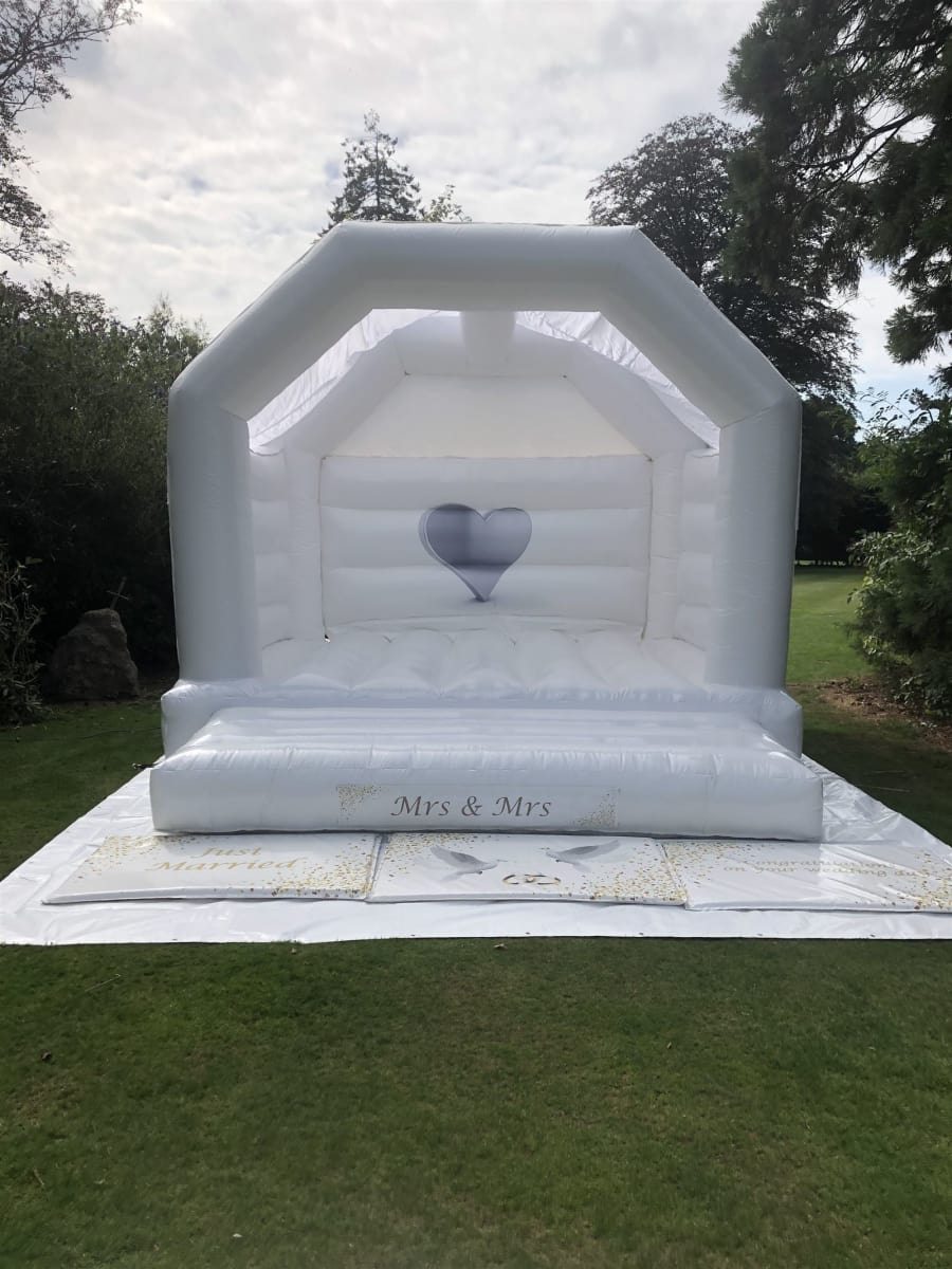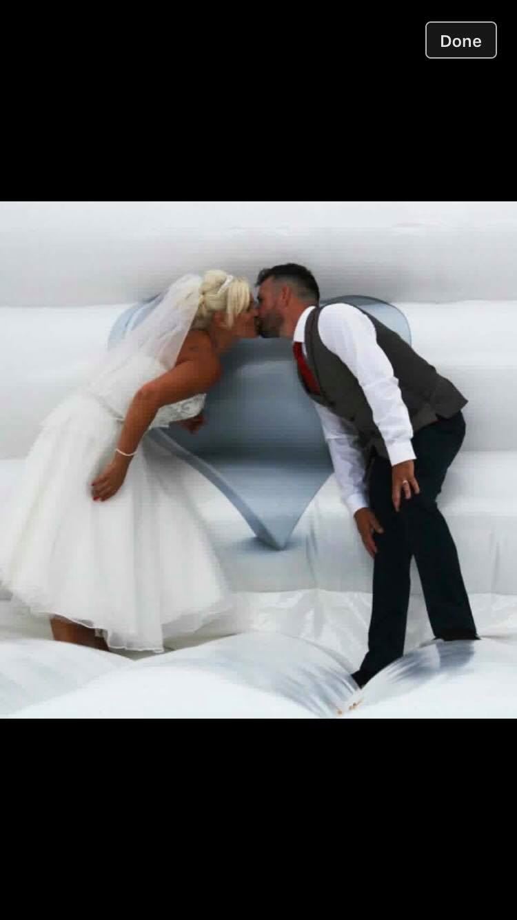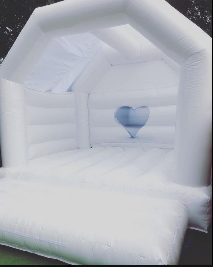 This is a beautiful, white, wedding bouncy castle which is suitable for both adults and children.