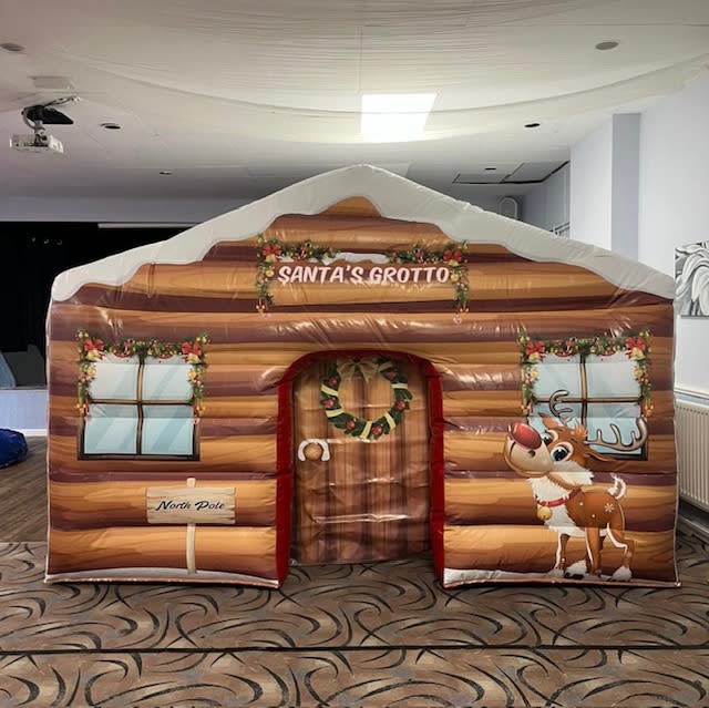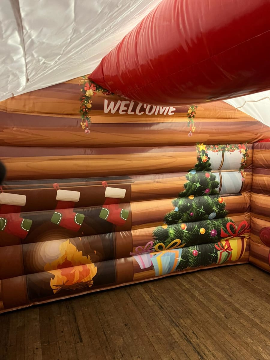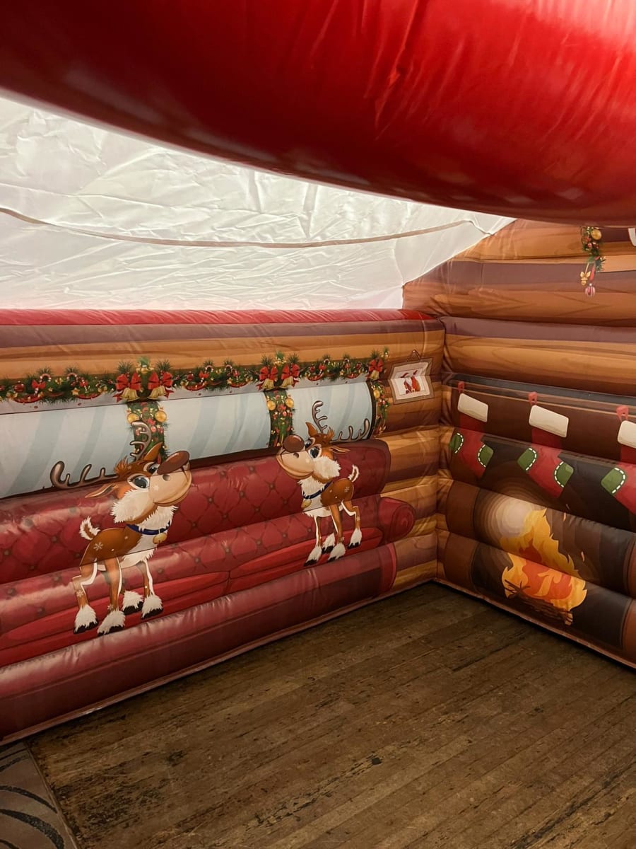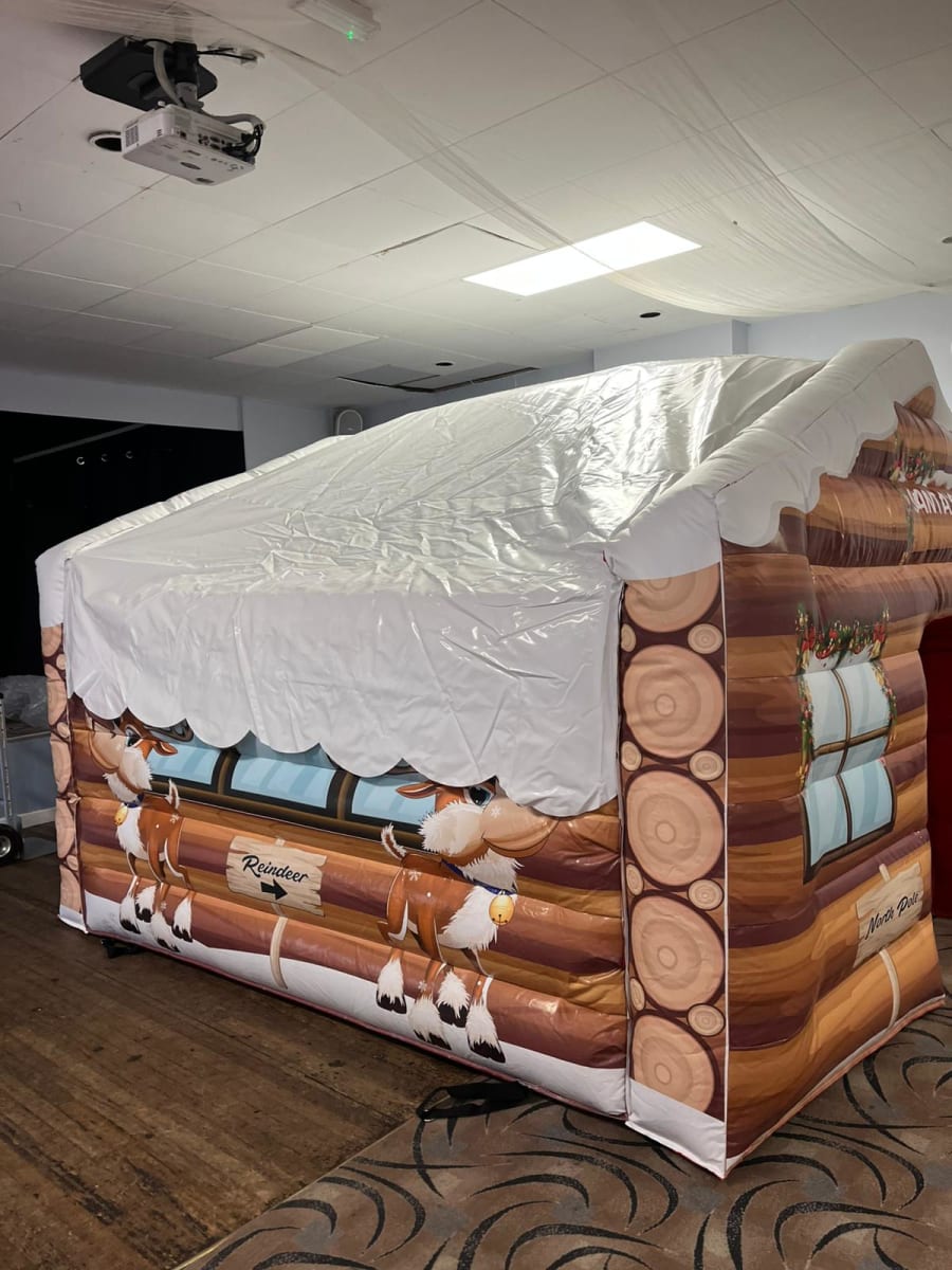 Step into a world of festive wonder with our enchanting Santa's Grotto! Perfect for creating unforgettable holiday memories, this inflatable log cabin is adorned with charming Christmas artwork featuring Santa, Rudolph, and other reindeer. Decorated with holly, bells, and Christmas tree designs, it sets the perfect scene for any holiday event.
